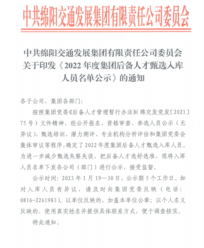 中共綿陽交通發(fā)展集團(tuán)有限責(zé)任公司委員會關(guān)于印發(fā)《2022年度集團(tuán)后備人才甄選人庫人員名單公示》的通知