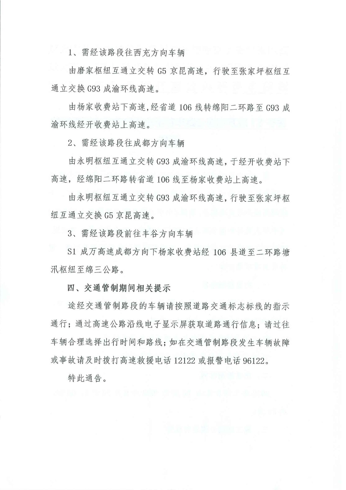 關(guān)于S1成萬(wàn)高速公路豐谷至永明段實(shí)行交通管制的通告
