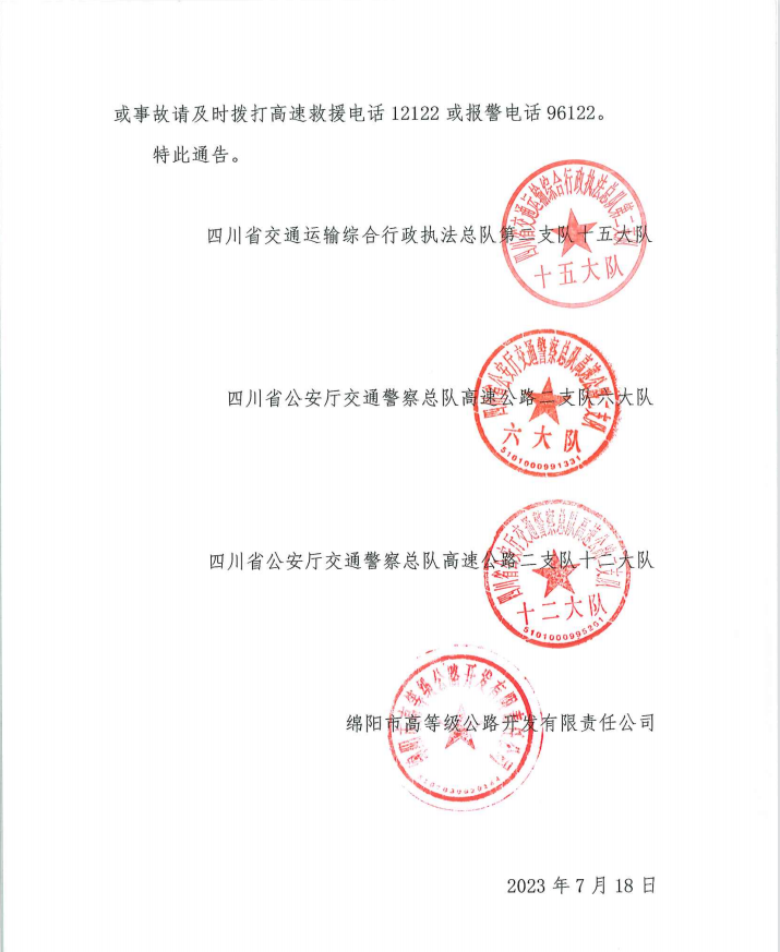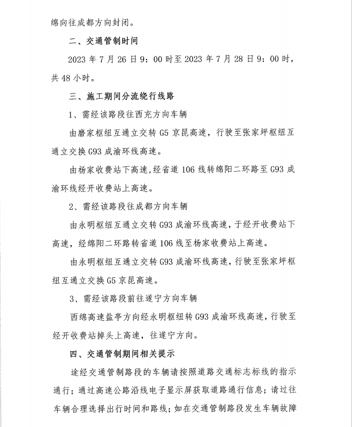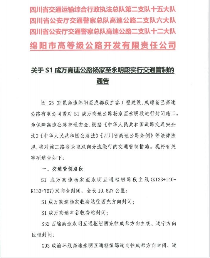 關于S1成萬高速公路楊家至永明段實行交通管制的通告