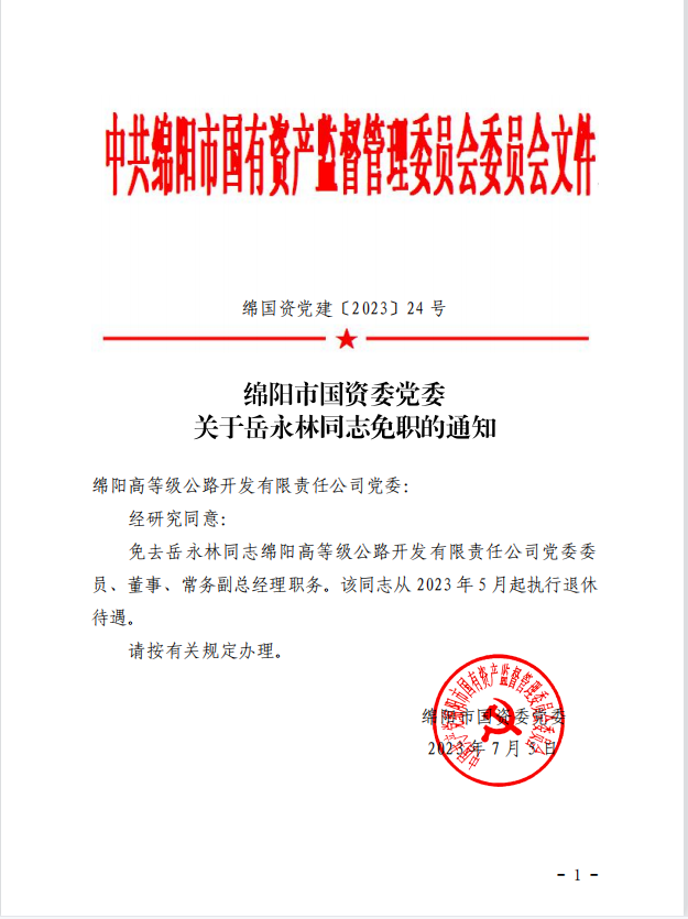 綿陽市國(guó)資委黨委《關(guān)于岳永林同志免職的通知》