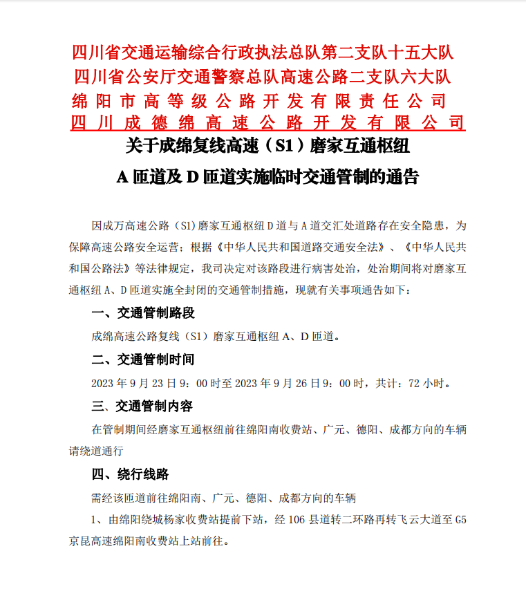 關于成綿復線高速(S1)磨家互通樞紐A匝道及D匝道實施臨時交通管制的通告