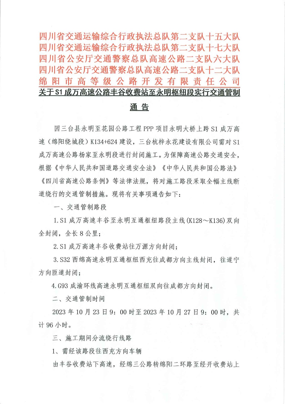 關(guān)于S1成萬高速公路豐谷收費站至永明樞紐段實行交通管制通告