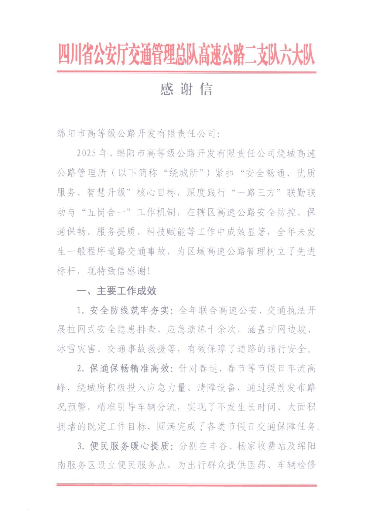 1月15日,高開司收到來自四川省公安廳交通管理總隊高速公路二支隊六大隊的一封感謝信。信中對高開司繞城高速2025年度“安全暢通、優(yōu)質(zhì)服務(wù)、智慧升級”核心目標(biāo),深度踐行“一路三方”聯(lián)勤聯(lián)動與“五崗合一”工作機制,在轄區(qū)高速公路安全防控、保通保暢、服務(wù)提質(zhì)、科技賦能等工作中成效顯著,全年未發(fā)生一般程序道路交通事故,為區(qū)域高速公路管理樹立了先進(jìn)標(biāo)桿,給予高度贊譽,對公司與高速公安攜手筑牢道路安全防線、全力保障公眾出行順暢的堅實舉措表達(dá)誠摯謝意,字里行間滿含認(rèn)可與期許。